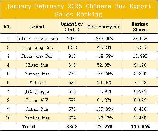 For the first two months of 2025, **Golden Travel Bus** maintained its lead with total exports of 2,074 units, a meteoric year-on-year rise of 235.06%, and a market share of 23.55%, showcasing stable and robust performance.